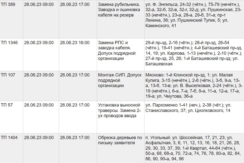 С полным списком адресов, где 26 июня не будет электроэнергии, а также с видами выполняемых работ, можно ознакомиться в таблице, приведенной ниже.