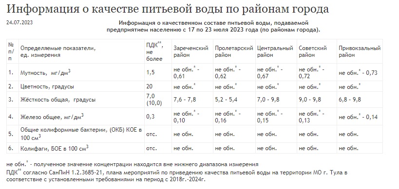Показатели качества питьевой воды в пяти округах Тулы с 17 по 23 июля 2023 года озвучили специалисты АО «Тулагорводоканал».