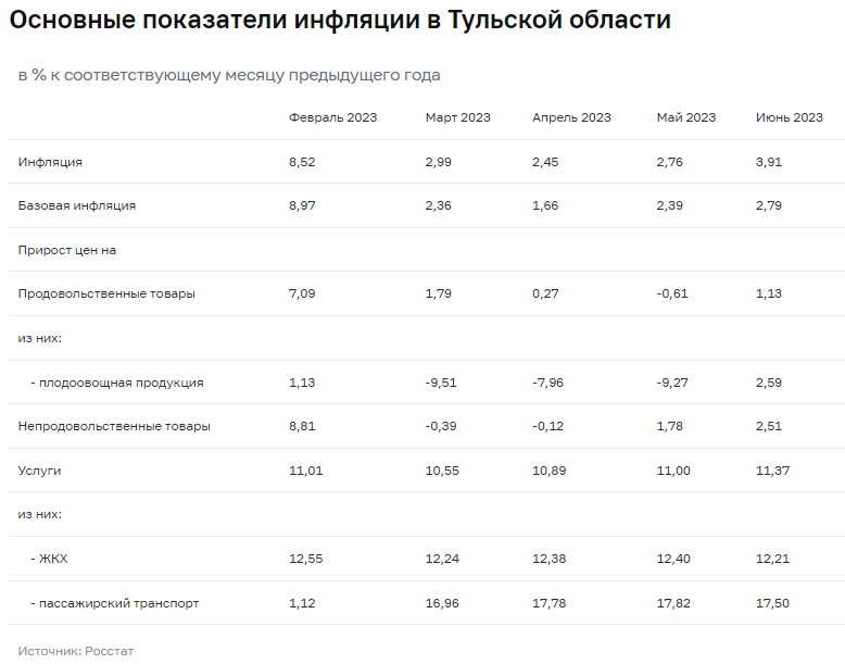 Уровень годовой инфляции за последний месяц увеличился в целом по России и по ЦФО. При этом показатель по Тульскому региону оказался выше общероссийского (3,25%) и в целом по ЦФО (3,58%).