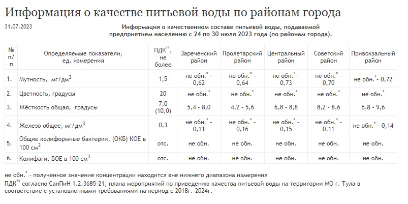О показателях качества питьевой воды в пяти округах Тулы с 24 по 30 июля 2023 года рассказали специалисты АО «Тулагорводоканала».