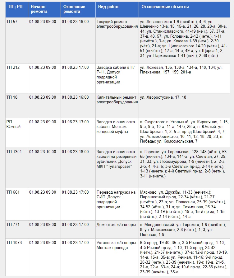 С полным списком адресов, попадающих под плановое отключение света 1 августа, а также с видами проводимых работ можно ознакомиться в таблице, приведенной ниже.