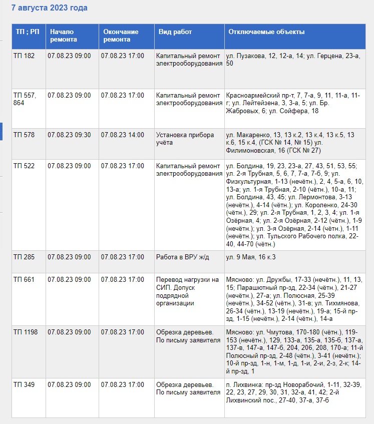 С полным списком адресов, попадающих под плановое отключение света 7 августа, а также с видами проводимых работ, в числе которых капитальный ремонт и обрезка деревьев, можно ознакомиться в таблице, приведенной ниже.