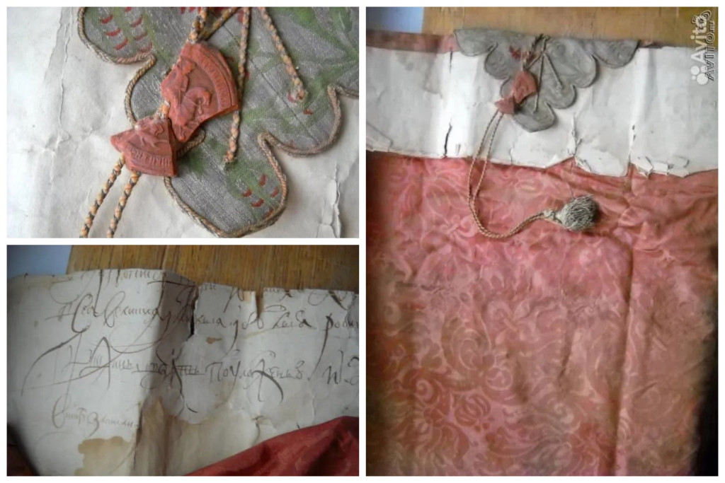 В Туле продают фрагмент жалованной грамоты поручику Боборыкину от 22 июля 1760 года. Она состоит из пергамента, парчи, шнура с серебряной нитью и императорской печати из красного воска.