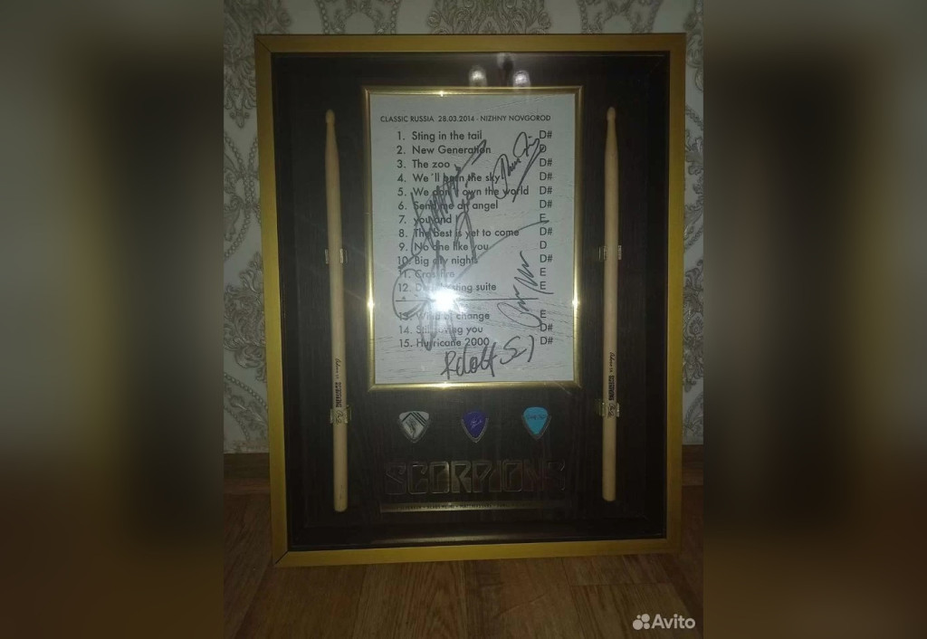 Автографы, личные медиаторы и барабанные палочки, как отмечают в объявлении, были получены лично от группы Scorpions во время тура по России в 2014 году. Расписались музыканты на концерте в Нижнем Новгороде. Коллекционный предмет помещен в стеклянную рамку, которую можно повесить на стену.