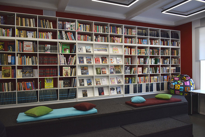 Помещение библиотеки разделено на тематические зоны: событийная площадка с мультимедийным и звуковым оборудованием, зона для чтения и работы за компьютером, игровая зона с системой виртуальной реальности и настольными играми.