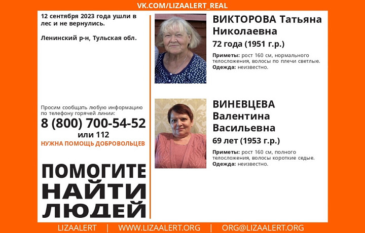 Вчера, 12 сентября, в бывшем Ленинском районе Тулы пропали две пожилые женщины. 72-летняя Викторова Татьяна Николаевна и 69-летняя Виневцева Валентина Васильевна ушли в лес и не вернулись.