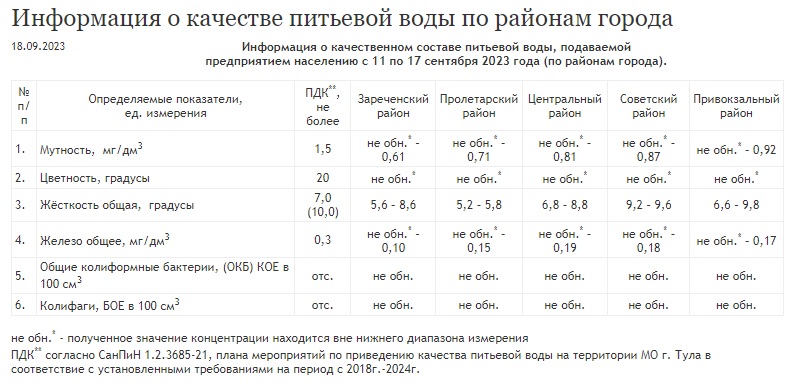 О показателях качества питьевой воды в пяти округах Тулы с 11 по 17 сентября 2023 года рассказали местным жителям специалисты АО «Тулагорводоканала».