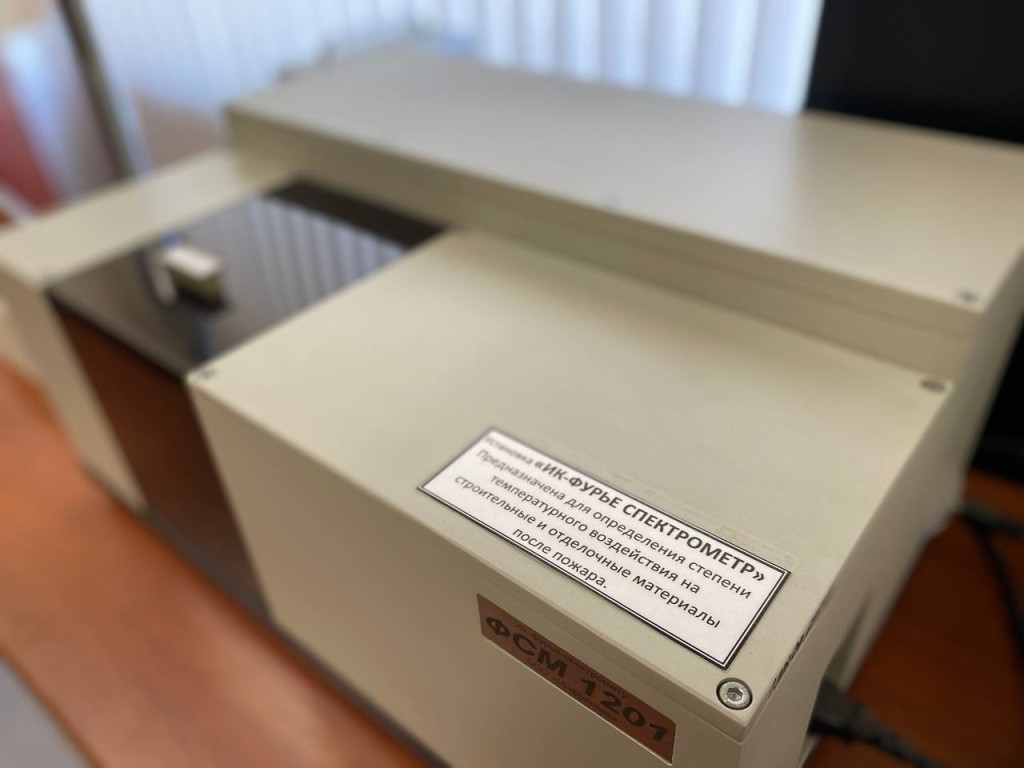 В оборудованном кабинете сотрудники лаборатории проводят экспертизу на специальных установках: изымаются с места пожара предметы, которые имеют отношение к возгоранию.