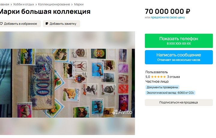 Также сообщается, что в коллекции можно найти марки различной тематики, в том числе, из разных стран мира. Возможна поштучная продажа экземпляров, однако, цена при таком варианте не уточняется.«Сосчитать не могу, постоянно сбиваюсь. Их слишком много», — отмечает продавец.