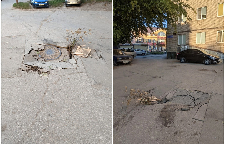 По их словам, такая ситуация во дворе этих домов происходит не впервые – асфальтовое покрытие во дворе оседает каждый год, а управляющая компания не предпринимает мер по устранению проблемы. На фото можно увидеть, как асфальт провалился вокруг канализационного коллектора.