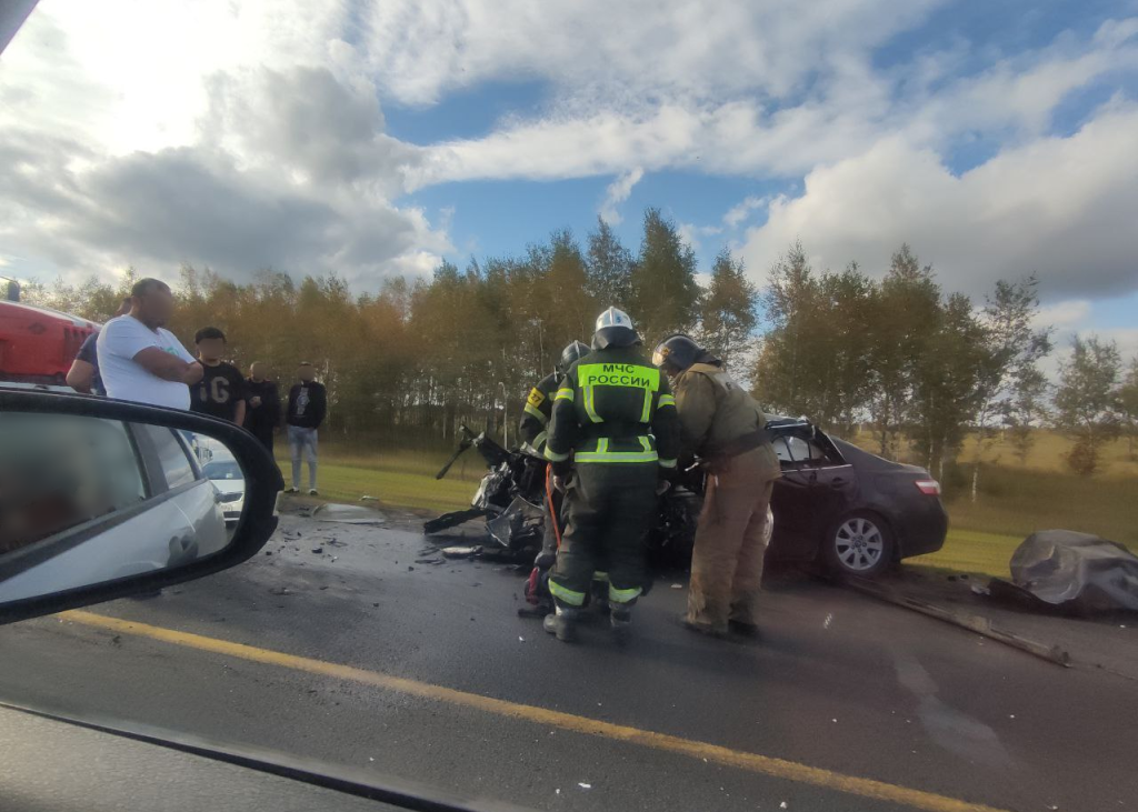 По информации нашего корреспондента, произошло лобовое столкновение легкового автомобиля и грузовика, перевозившего трубы. В результате происшествия грузовик опрокинулся на обочину, а легковой автомобиль смяло со стороны водителя.
