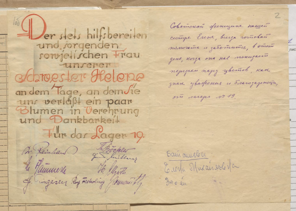 История запомнила еще одного медицинского работника. Елена Михайловна Баташева была медсестрой лагеря № 19 во время Великой Отечественной войны. Немецким военнопленным она запомнилась своим человечным отношением. На открытке, адресованной ей, подписи 8 немецких солдат, желтый цветок и теплые слова: