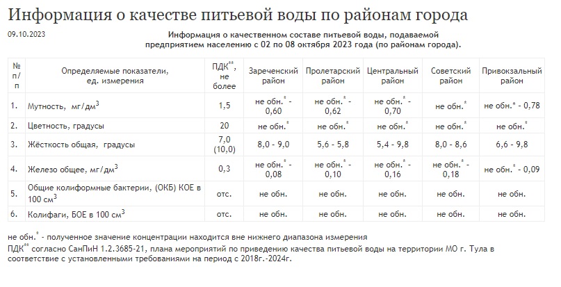 О показателях качества питьевой воды в пяти округах Тулы со 2 по 8 октября 2023 года рассказали местным жителям специалисты АО «Тулагорводоканала».