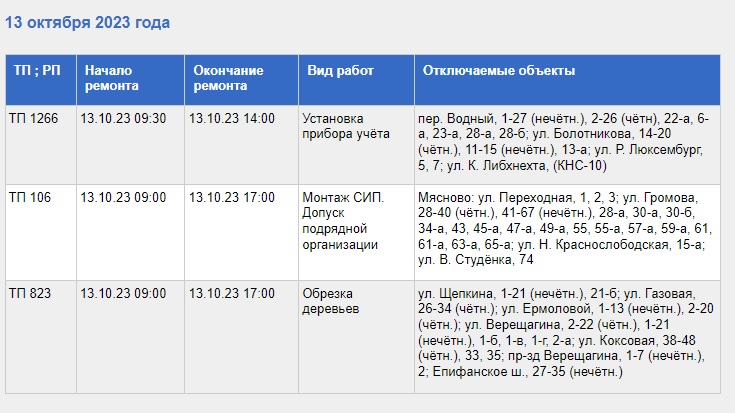 С полным списком адресов, попадающих под плановое отключение света 13 октября, а также с видами проводимых работ, можно ознакомиться в таблице, приведенной ниже.