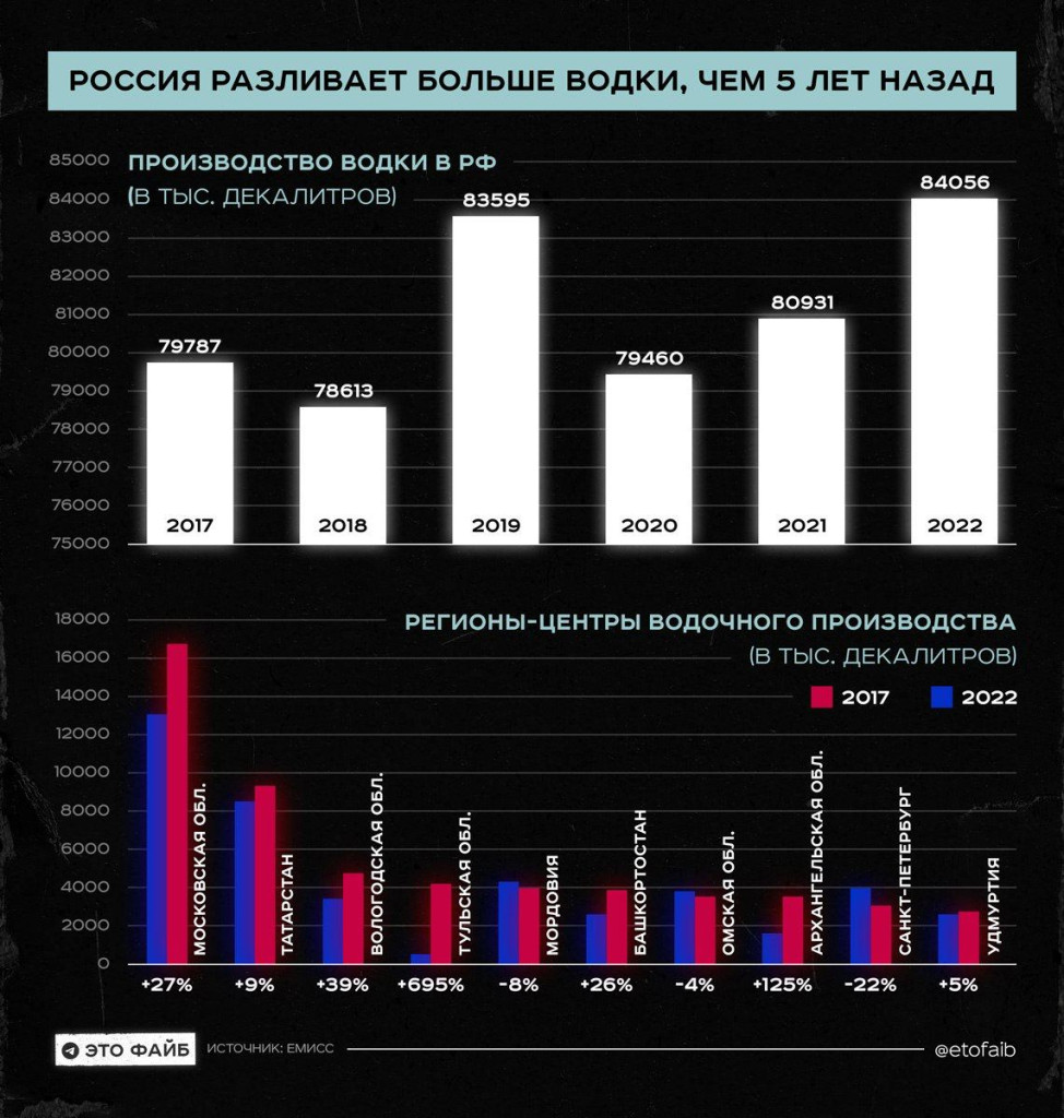 Тула стала лидером по приросту производства водки в России. За пять лет тульское водочное хозяйство увеличилось в семь раз, сообщает преподаватель факультета социальных наук ВШЭ Александр Файб в своем Telegram-канале.