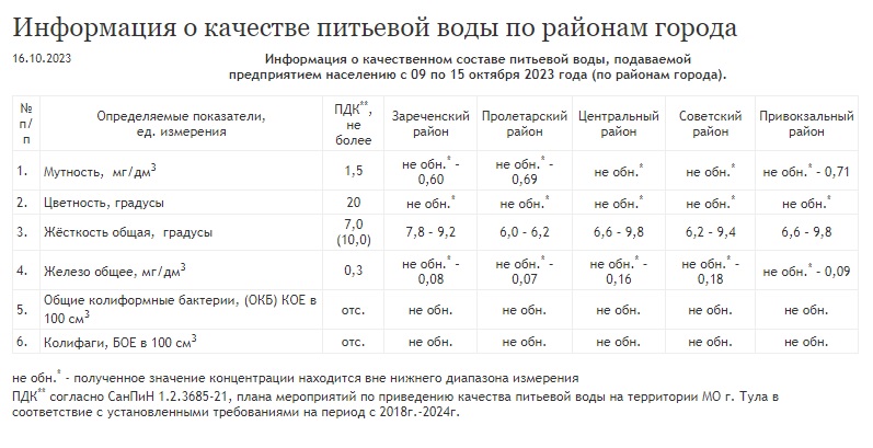 О показателях качества питьевой воды в пяти округах Тулы со 9 по 15 октября 2023 года рассказали местным жителям специалисты АО «Тулагорводоканала».