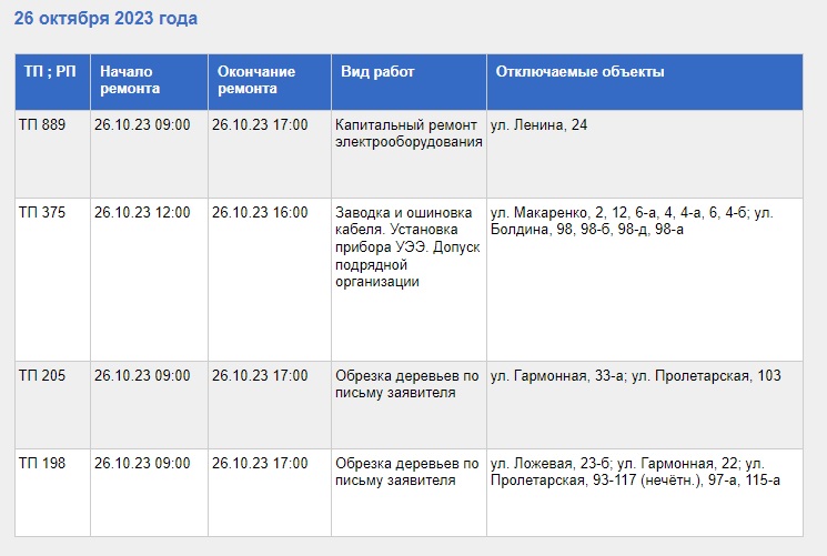 С полным списком адресов, попадающих под плановое отключение света 26 октября, а также с видами проводимых работ, можно ознакомиться в таблице, приведенной ниже.