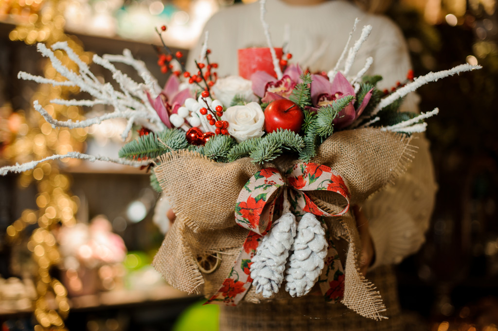 Цветы зимой – это всегда магия. Новогодние ёлочно-цветочные украшения могут быть в праздничных корзинах, флористических боксах, декоративных ящиках, красивых вазах, бокалах или в виде живых гирлянд. Их можно сделать самостоятельно или на заказ у флористов, которые занимаются созданием праздничной атмосферы на профессиональной основе и имеют все необходимое для этого.