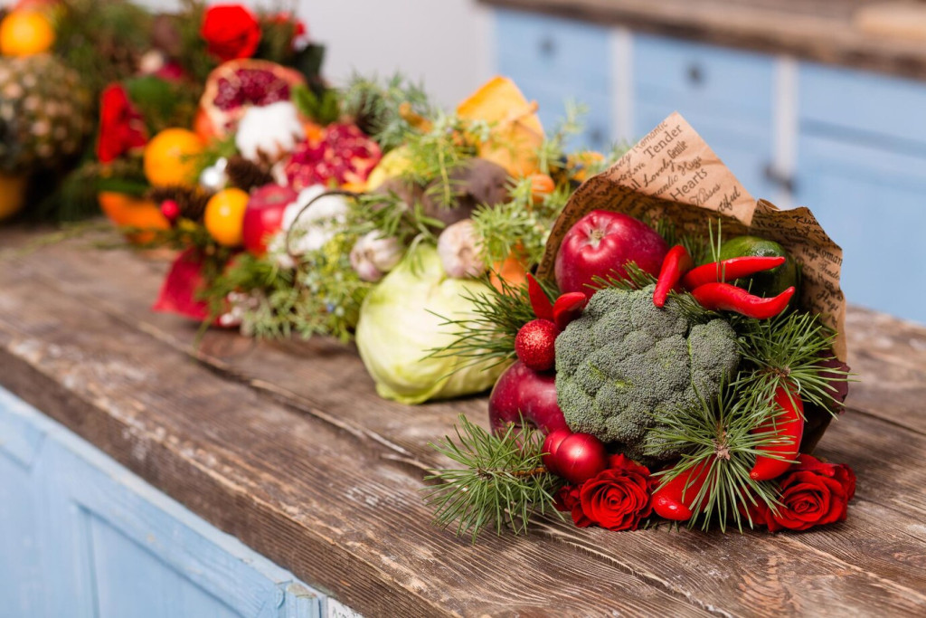 Кстати, маленькие новогодние букетики, которыми можно украсить, станут прекрасным подарком или дополнением к нему. В них можно использовать конфеты в нарядных фантиках, аппетитные овощи и фрукты.