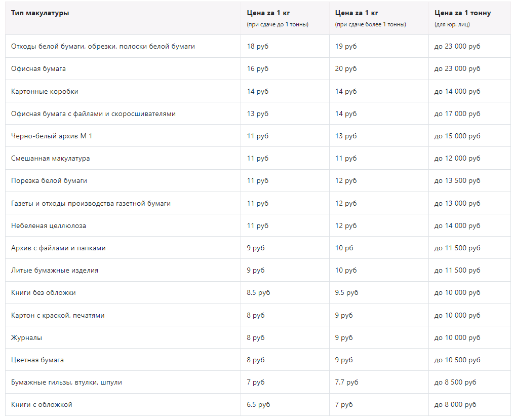 Кроме того, в Киреевском районе сдать макулатуру можно в организации «Втор сбор», в Донском – компании «Вторсырье», а в Туле – компании «ПрофМетЦентр» на Ханинском проезде. В этих компаниях также платят за сданную макулатуру – например, за килограмм картона «Втор сбор» предлагает семь рублей, а «ПрофМетЦентр» – восемь рублей. При весе вторсырья свыше тонны компания «ПрофМетЦентр» добавляют еще один рубль к обычной цене за килограмм.