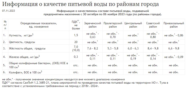 О показателях качества питьевой воды в пяти округах Тулы с 30 октября по 6 ноября 2023 года рассказали местным жителям специалисты АО «Тулагорводоканала».