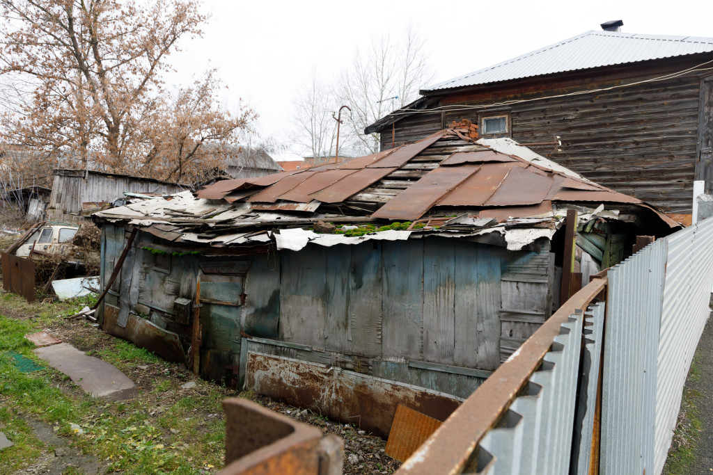 Лидер по количеству таких домов – улица Оборонная. Один за другим здесь стоят деревянные дома, некоторые из которых совсем в непрезентабельном виде – разрушенные крыши, забитые досками окна, обвалившийся и закрытый пленкой фасад.