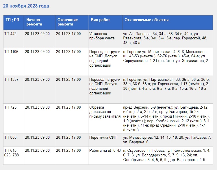 С полным списком адресов, где не будет электроэнергии, а также с видами выполняемых работ, в число которых вошли ремонт электрооборудования и перезаводка кабеля, можно ознакомиться в таблице, приведенной ниже.