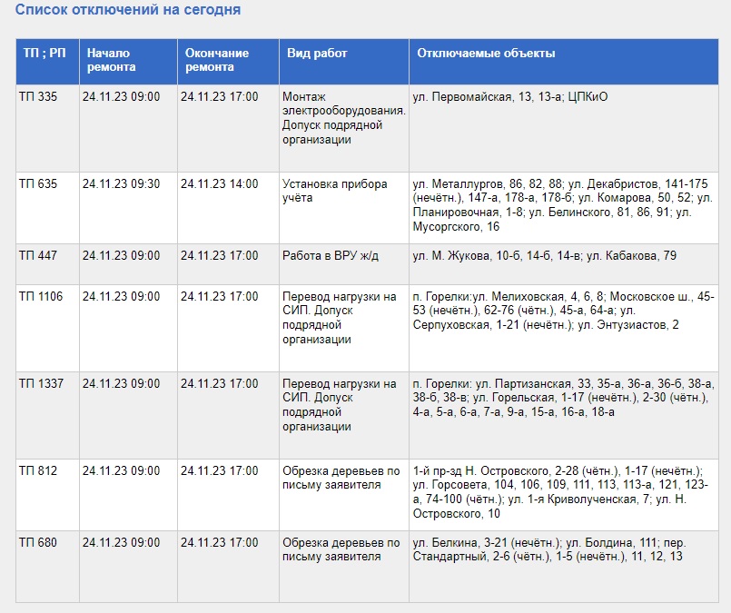 Обращаем внимание, что по всем адресам время начала и завершения ремонтных работ, послуживших поводом к отключению света, будут различаться в зависимости от адреса проведения.