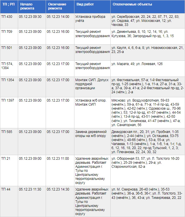 Часть Тулы останется без электричества 5 декабря из-за плановых работ