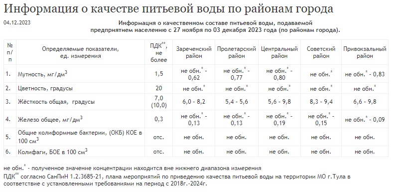 «Тулагорводоканал» обновил данные о показателях качества питьевой воды в пяти округах Тулы с 27 ноября по 3 декабря 2023 года.