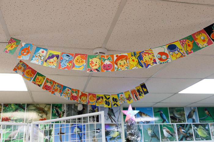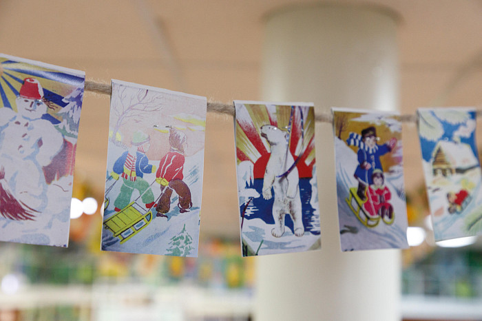Сохранились и старые бумажные гирлянды, которые вешали под потолок. Например, можно увидеть гирлянды со сказочными персонажами и зимними забавами.