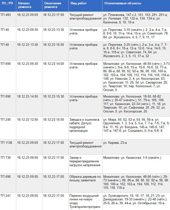 С полным списком адресов, где 18 декабря не будет электроэнергии, а также с видами выполняемых работ, можно ознакомиться в таблице, приведенной ниже.