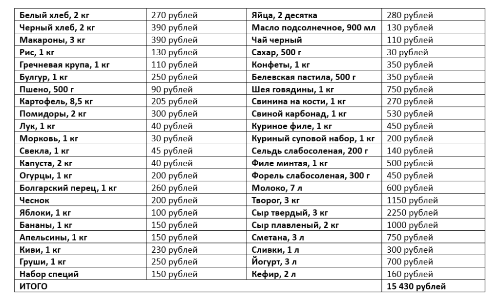 Исходя из этих рекомендаций Тульская служба новостей составила месячный набор продуктов и выяснила их стоимость в сетевых супермаркетах.