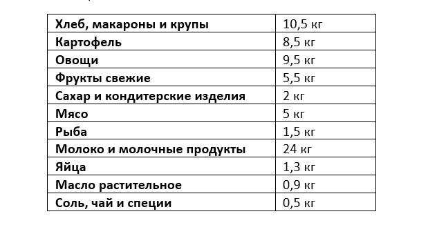 Продовольственная корзина на месяц для взрослого человека предполагает наличие в рационе следующих типов продуктов, при этом конкретные товары можно подбирать самостоятельно в зависимости от вкусовых предпочтений.