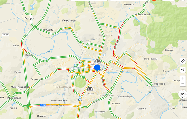 Особенно трудная ситуация сложилась на Венёвском шоссе, начиная от улицы Каракозова. Пробки наблюдаются также на улицах Кирова, Кутузова и Вильямса в обе стороны.