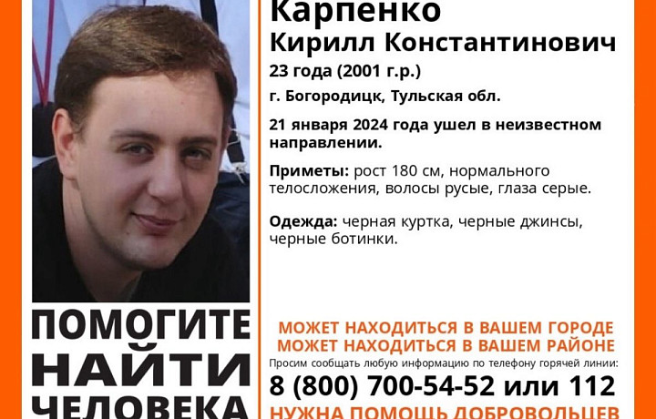 В Тульской области правоохранители и поисковый отряд «ЛизаАлерт» разыскивают 23-летнего молодого человека из Богородицка.