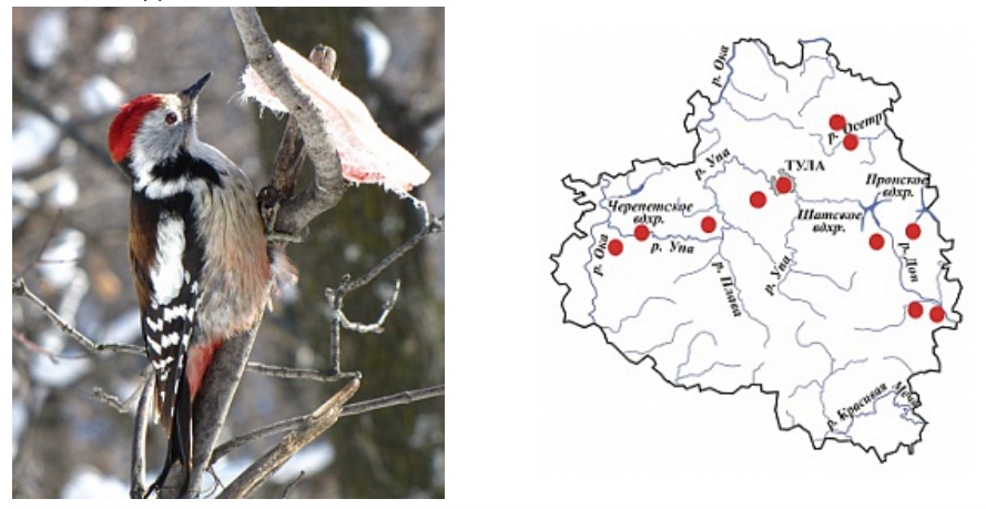 Например, в Красную книгу региона занесен средний пестрый дятел. Его можно встретить в Веневском, Заокском и Щекинском районах, а также рядом с Новомосковском. Птицу с красной «шапочкой» видели в Ясной Поляне и Центральном парке Тулы.