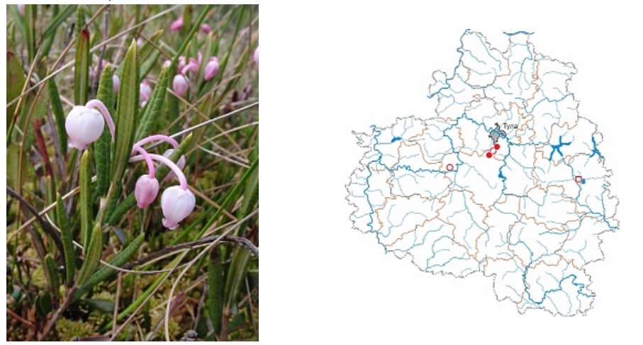 Фото: Красная книга Тульской областиНа болотах можно увидеть редкие хамедафну, пушицу, подбел обыкновенный. Так, подбел – это вечнозеленый небольшой кустарник с нежными розоватыми цветами. Он растет на карстовом болоте между деревней Кочаки и Ясной Поляной.