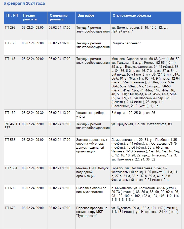 С полным списком адресов, попадающих под плановое отключение света 6 февраля, а также с видами проводимых работ, можно ознакомиться в таблице, приведенной ниже.