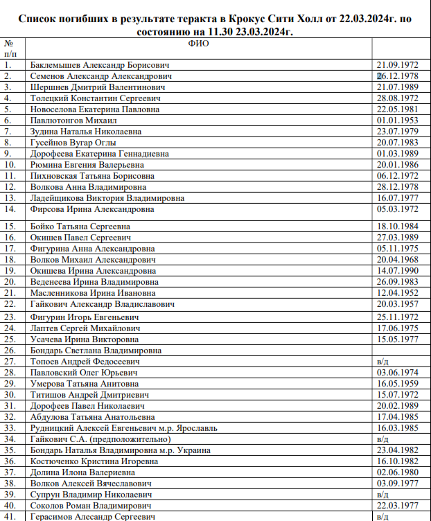 Минздрав РФ опубликовал первый список опознанных погибших в результате теракта в подмосковном «Крокус Сити Холл». В нем указаны данные 37 человек.