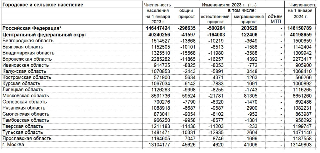 Приток мигрантов меняет показатели настолько, что по общим потерям численности населения Тульская область улучшает позиции, пропуская вперед Тверскую, Владимирскую и Белгородскую области.