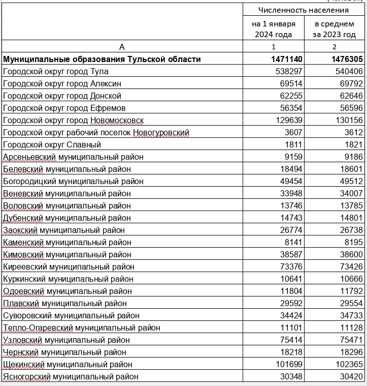 Туластат опубликовал данные о численности населения в районах и городах региона. Так, в Туле на начало 2024 года проживали 538 297 человек. Годом ранее – более 540 тысяч. На втором месте по численности населения расположился Новомосковск – 129 639 жителей, на третьем – Щекинский район, где проживают более ста тысяч человек.