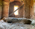 Кое-где стены и потолочные своды храма сильно закоптились. Возможно, внутри когда-то бушевал сильный пожар, или же копоть образовалась из-за выхлопов техники, ведь в послевоенное время в здании ремонтировали трактора. Местами заметны провалы в стенах – от естественного разрушения или от прилетевших в 1941-м снарядов. На некоторых окнах остались целыми металлические решетки. Можно замиетить и следы мародеров.