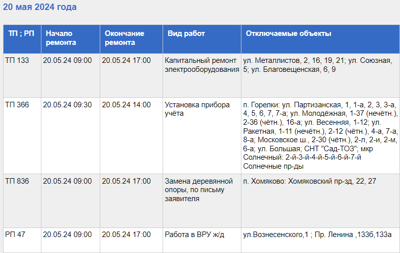 Ниже в таблице указано время отключения электричества и адреса, по которым отключат электричество, а также виды проводимых работ: