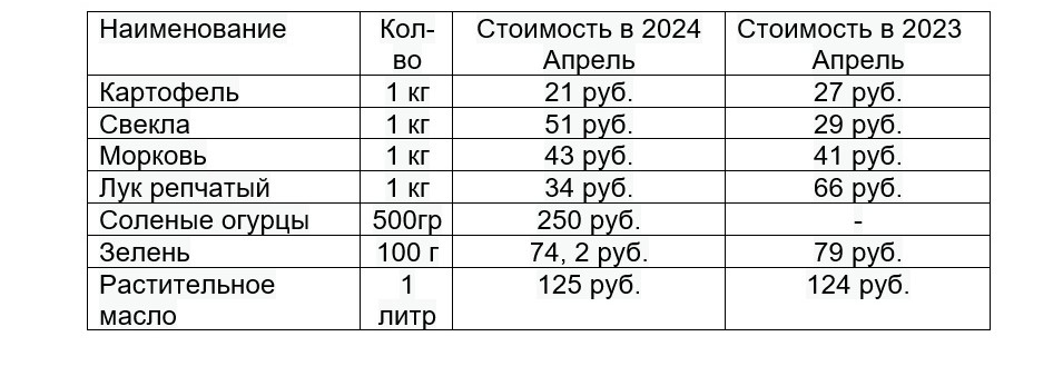 Данные о стоимости продуктов были взяты на сайте Росстата. Стоит отметить, из-за того, что сведений о ценах на маринованные огурцы и консервированных горох нет в сводках портала, стоимость на эти продукты рассчитывались усредненно, исходя из данных розничных сетей в Туле.