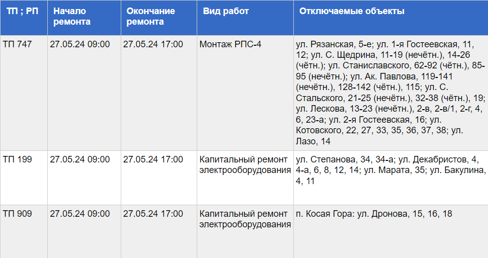 Ниже в таблице указано время отключения электричества и адреса, по которым отключат электричество, а также виды проводимых работ: