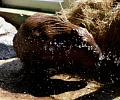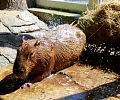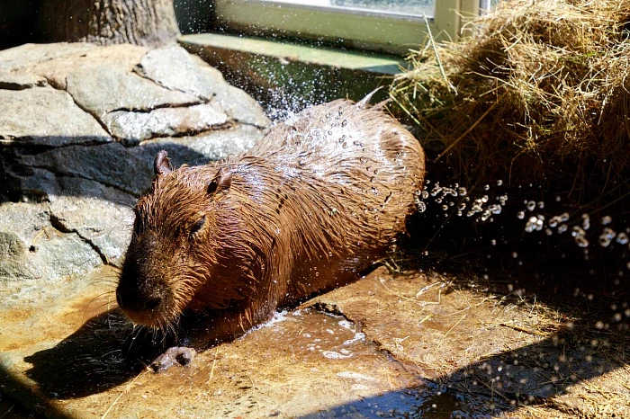 «Самое завораживающие зрелище для посетителей, как капибара принимает душ. Для нас, кончено, это звоночек, что пора убираться в вольере, так как капибара начинает купаться, преимущественно, чтобы справить свою большую нужду в воду. Этот рефлекс у них приобретен из естественных условий обитания. В дикой природе они селятся рядом с водоемами и скрывают таким образом свое место положение от хищников», — говорит Виктория Чибисова.