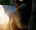 Капибара молчаливое животное, но все же звуки издает. Как рассказывает зоотехник, большая свинка издает очень высокий еле слышный пищащий звук. Скорее всего, стоя за стеклом, вы его не услышите.