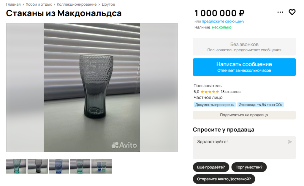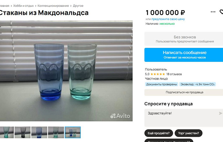 Стаканы из «Макдоналдс» выставили на продажу в Новомосковске за миллион рублей