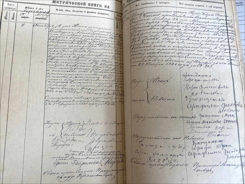 Примечательно, что первый Тульский отдел ЗАГС был открыт в здании бывшего полицейского управления на ул. Коммунаров, 49 (ныне – пр. Ленина). А первой актовой записью стал развод в июне 1918 г.», — рассказывает Татьяна Евсеева.